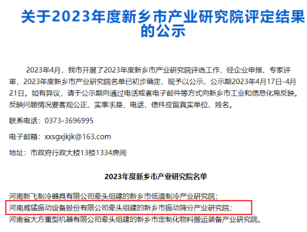 近日获悉,由威猛股份牵头组建的“新乡市振动筛分产业研究院”入选2023年度新乡市产业研究院。河南威猛振动作为“全国制造业(振动筛)单项冠 军示范企业”,公司拥有河南省企业技术中 心...